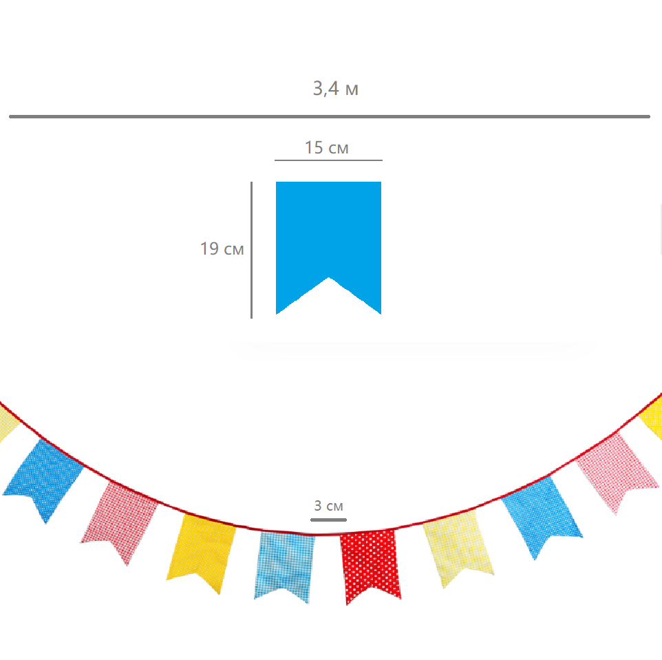 Гирлянда состоит из 12 флажков, общая длина составляет 3,4 м, расстояние между флажками 3 см, длина матерчатых флажков 2,1 м, длина лямок с обеих сторон по 50 см