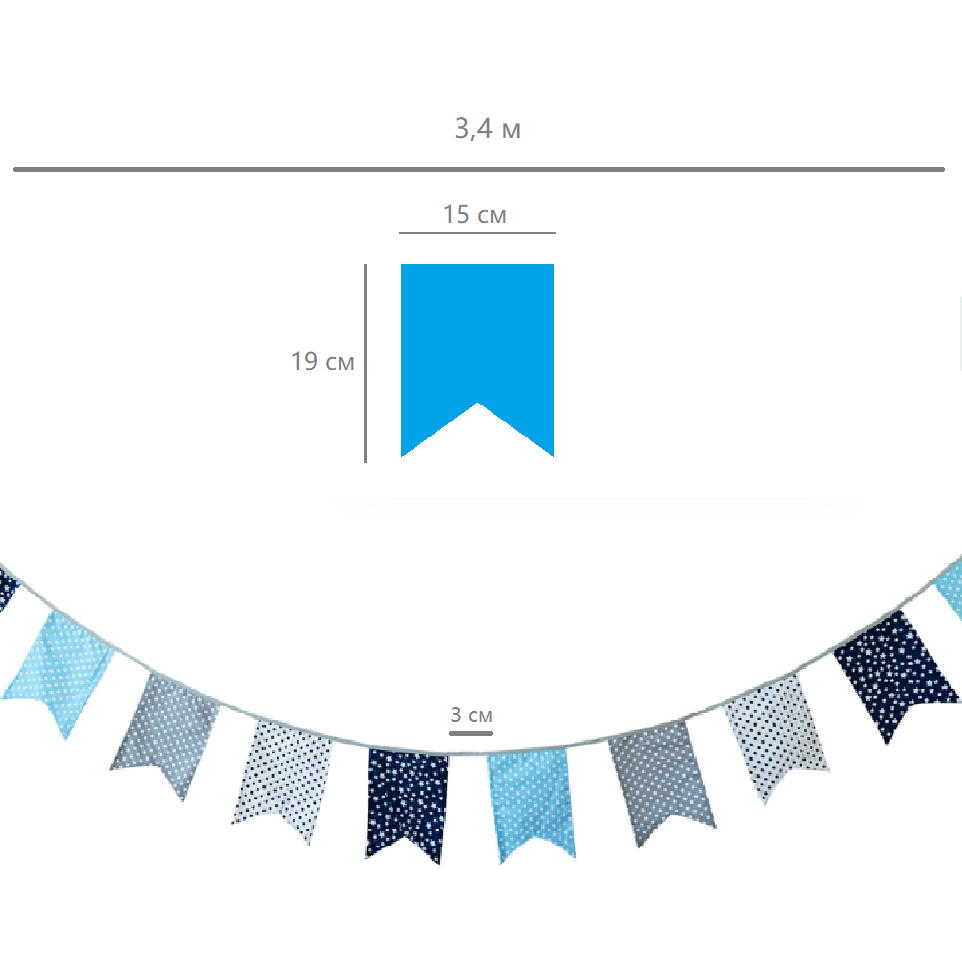 Гирлянда состоит из 12 флажков, общая длина составляет 3,4 м, расстояние между флажками 3 см, длина матерчатых флажков 2,1 м, длина лямок с обеих сторон по 50 см