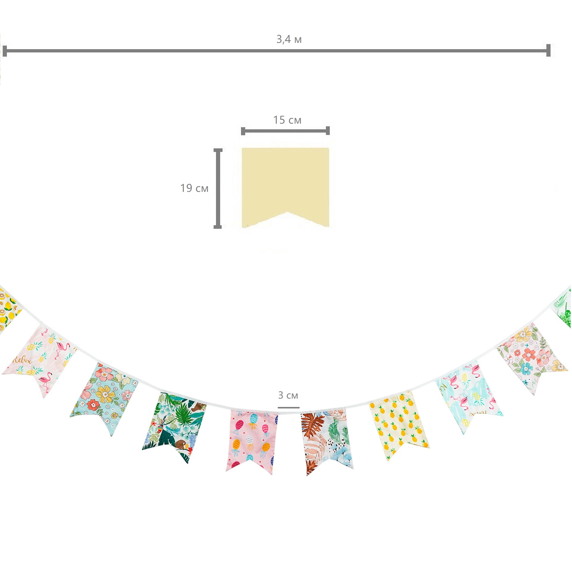 Гирлянда состоит из 12 флажков, общая длина составляет 3,4 м, расстояние между флажками 3 см, длина матерчатых флажков 2,1 м, длина лямок с обеих сторон по 50 см