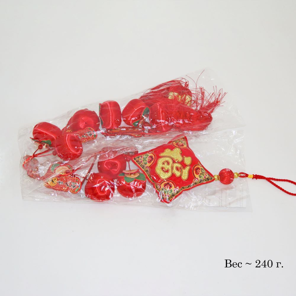 Композиция включает красные яблоки из шелковых нитей на пластиковой основе (размер 4×6 см), листья из флока с иероглифами, украшенными блеском, и и центральный элемент — ромб с устойчивым блестящим узором.