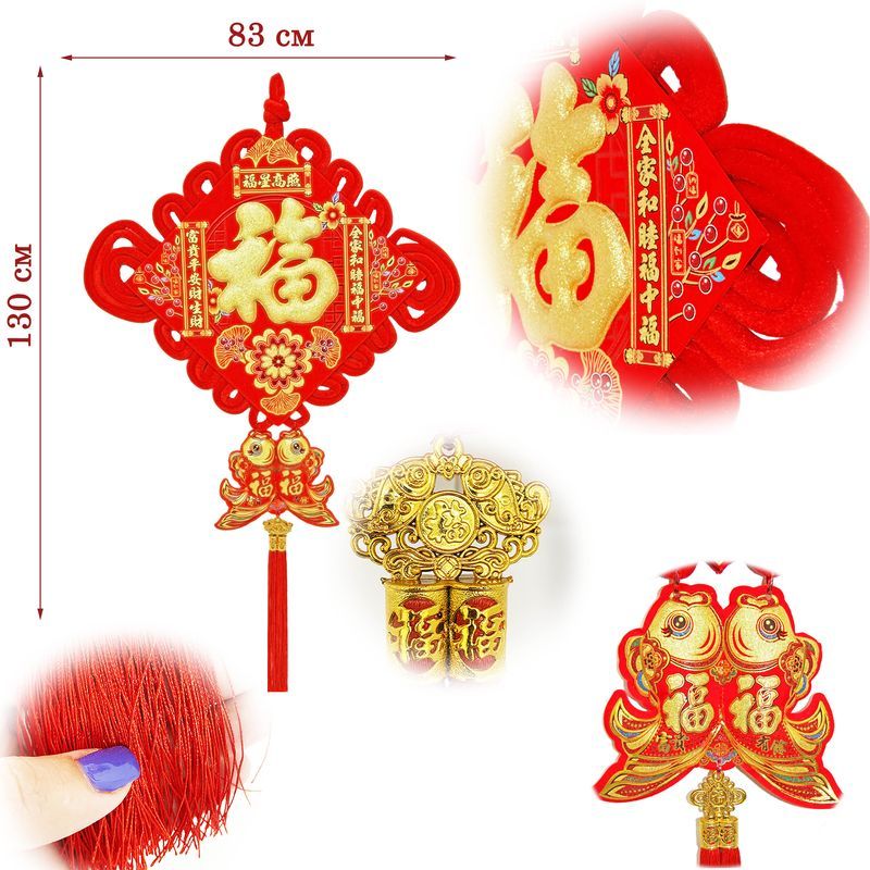 Традиционный китайский узел в форме ромба с символичным дизайном. Яркое сочетание красного бархата и золотых элементов создает эффектный акцент в интерьере.
