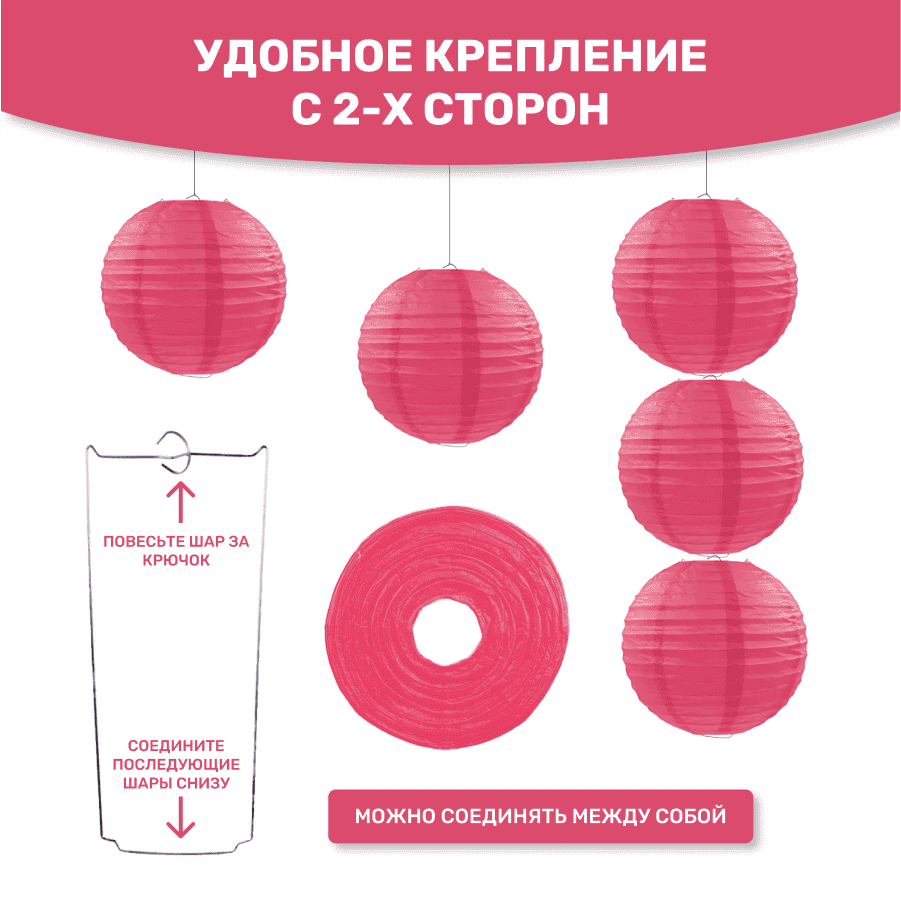 В комплект входит 8 бумажных фонариков и лента атласная.