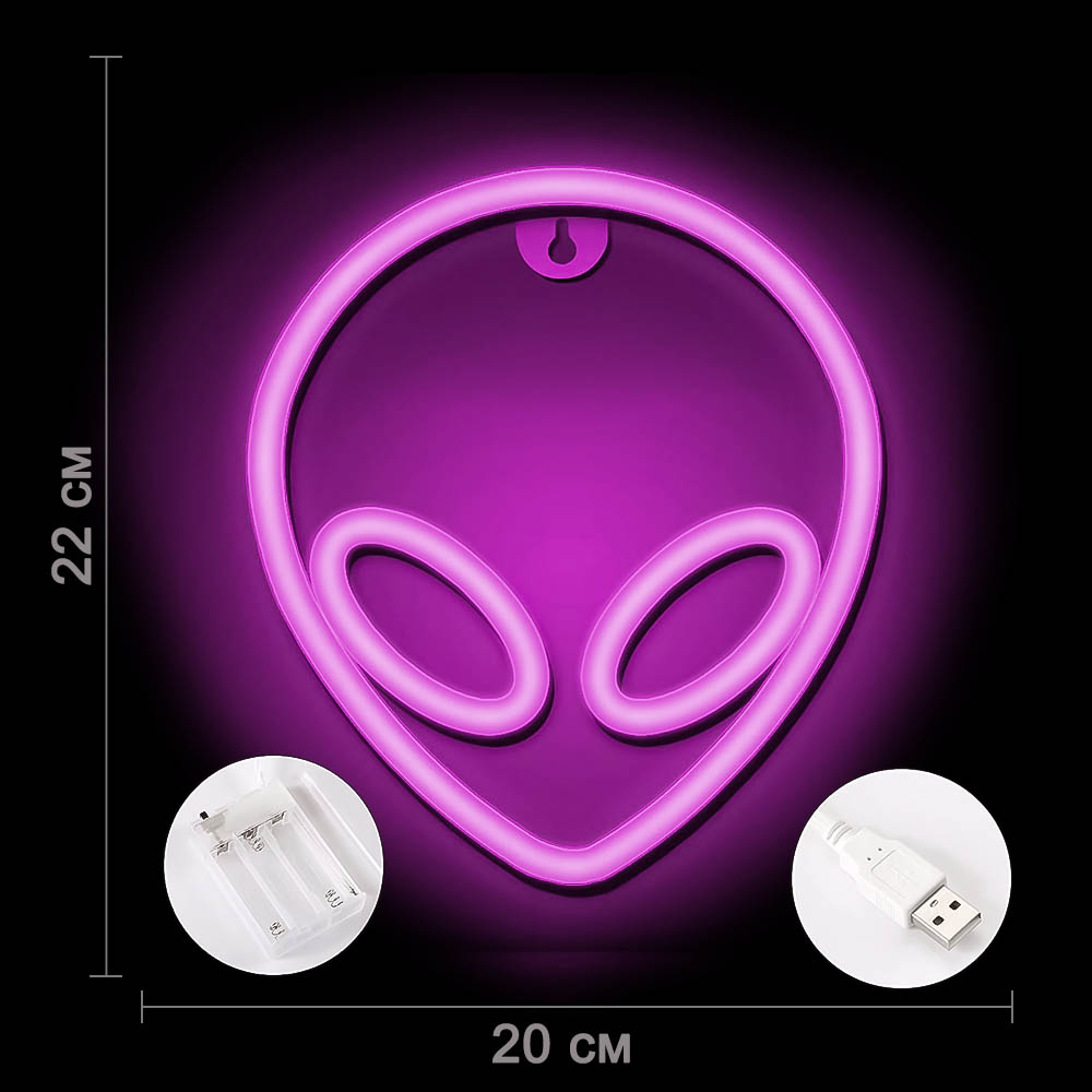 Неоновая подвеска "Инопланетянин" 22 х 20 см от батареек и USB, розовый