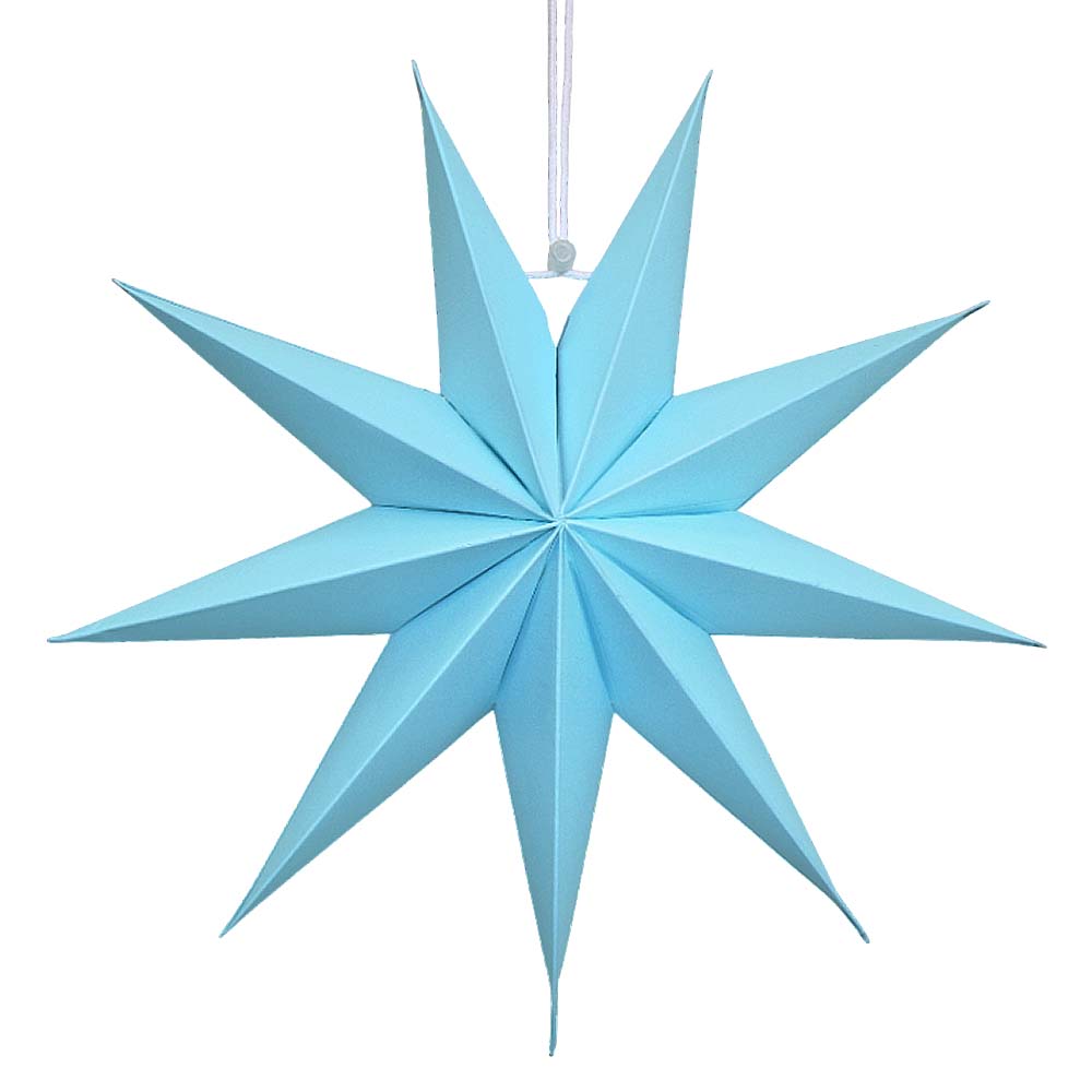Объёмная декоративная звезда из картона диаметром 30 см с 9 лучами. Оснащена встроенным шнурком для подвешивания. Поставляется в компактном сложенном виде и быстро собирается: специальный шнурок при затягивании придаёт изделию объём и фиксирует форму. После сборки звезда остаётся устойчивой без дополнительных креплений и может использоваться многократно.