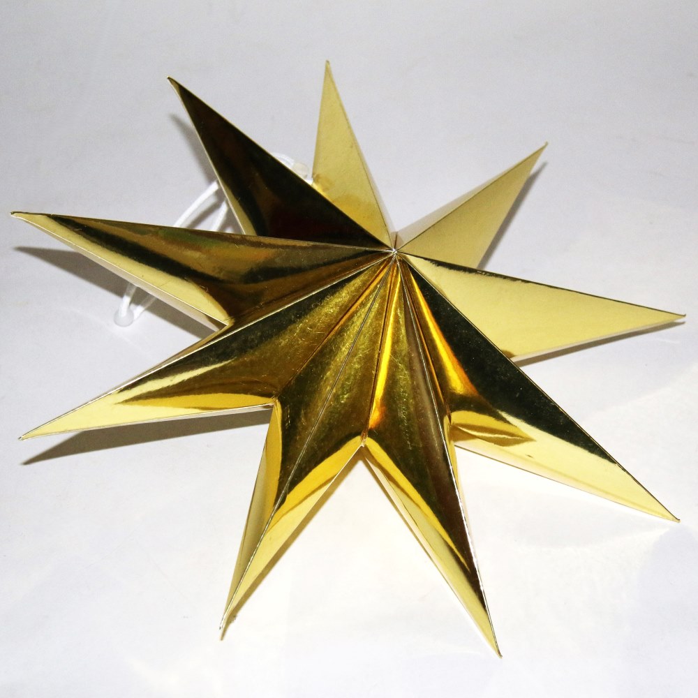 Объёмная девятиконечная звезда 45 см — декоративный элемент для интерьера и праздничного оформления. Лёгкая интерьерная звезда из картона хорошо держит форму и создаёт выразительный объём. Поставляется в сложенном виде, в комплекте шнур для фиксации объёма и подвеса.
