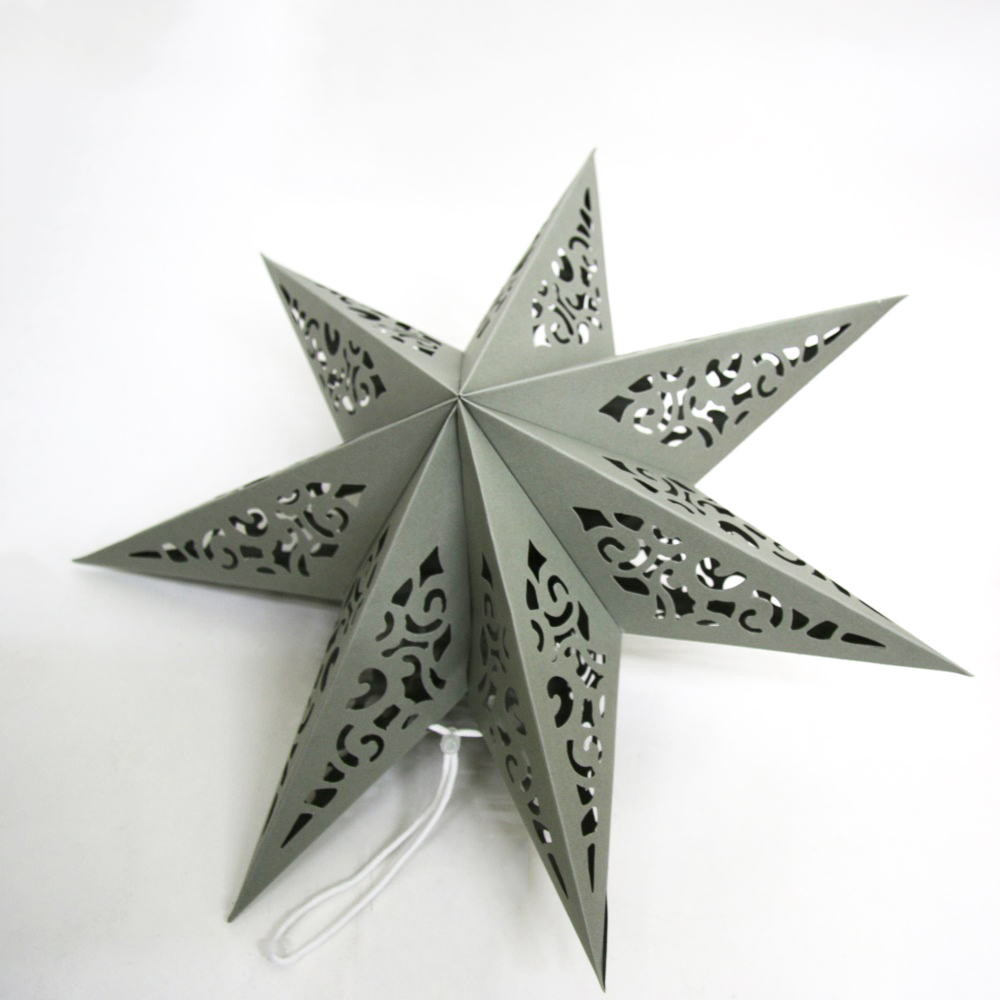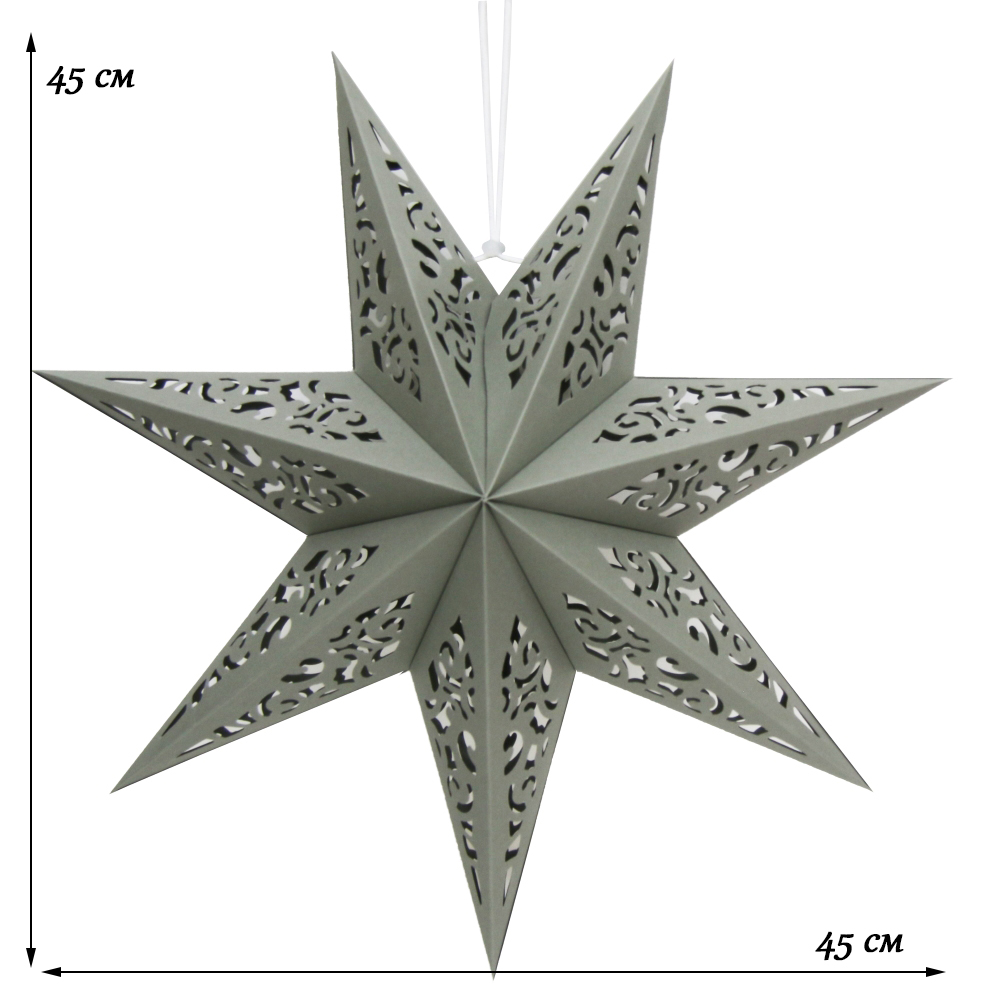 Семиконечная объемная звезда 45 см — великолепный декор из тонкого перфорированного картона. Создает красивые световые эффекты. Поставляется в сложенном виде, в комплекте шнур для фиксации объема и подвеса.